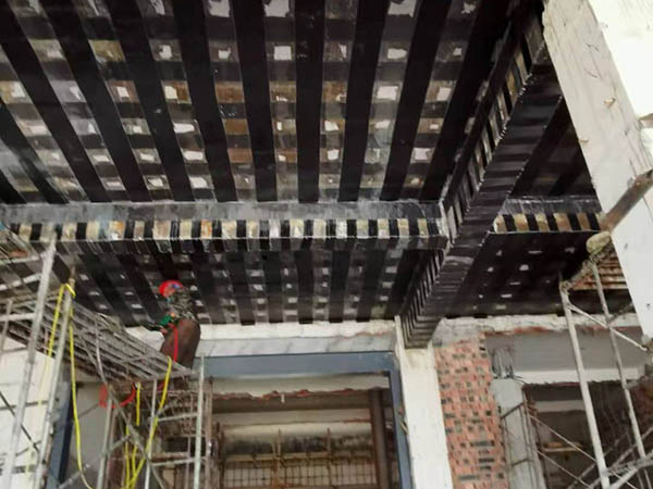 將抗拉強(qiáng)度極高的碳纖維用環(huán)氧樹脂預(yù)浸成為復(fù)合增強(qiáng)材料(單向連續(xù)纖維);用環(huán)氧樹脂粘結(jié)劑沿受拉方向或垂直于裂縫方向粘貼在要補(bǔ)強(qiáng)的結(jié)構(gòu)上,形成一個(gè)新的復(fù)合體,使增強(qiáng)粘貼材料與原有鋼筋混凝土共同受力增大結(jié)構(gòu)的抗裂或抗剪能力,提高結(jié)構(gòu)的強(qiáng)度、剛度、抗裂性和延伸性。